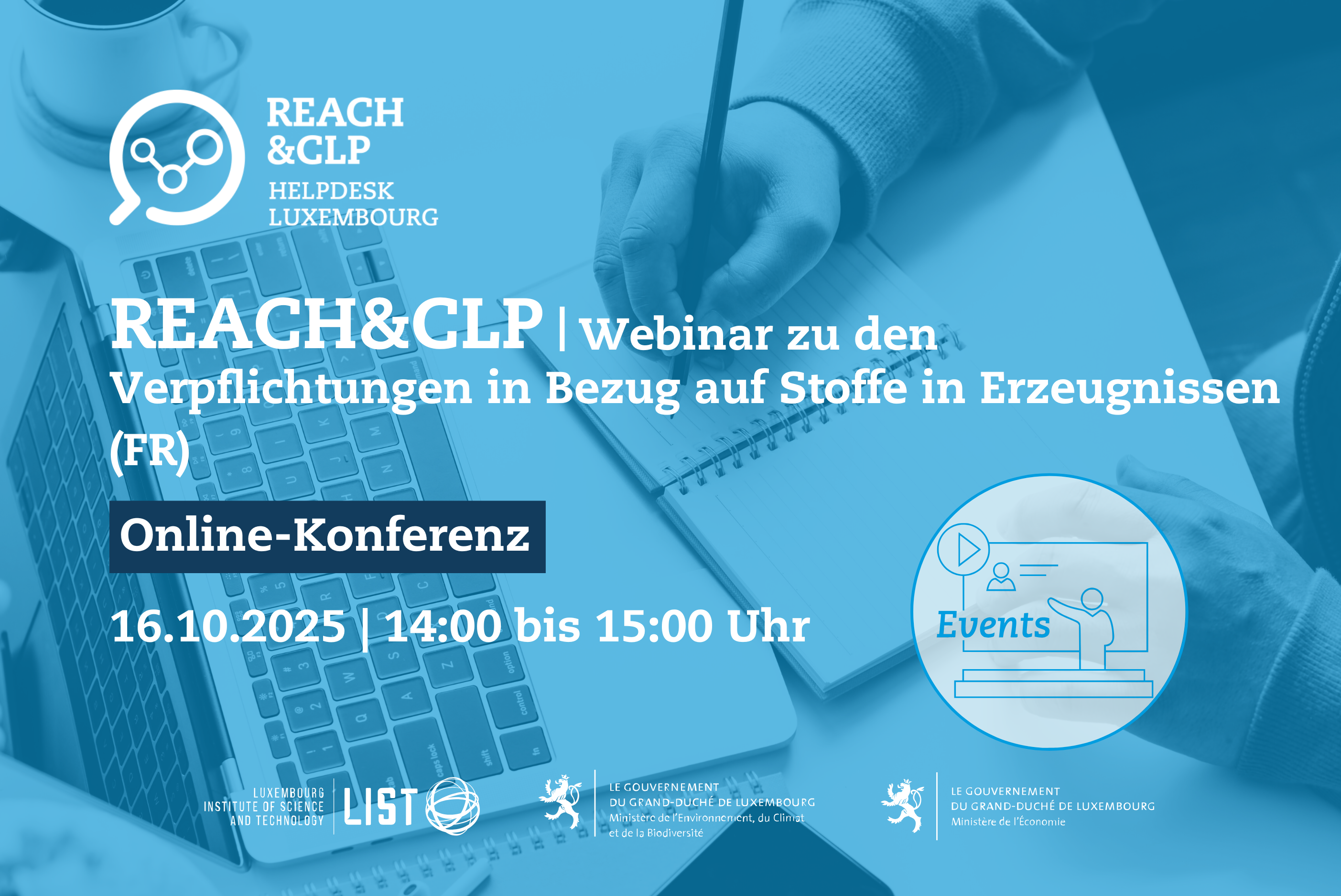 Der Helpdesk REACH&CLP Luxemburg organisiert ein Webinar zu den Verpflichtungen in Bezug auf Stoffe in Erzeugnissen. Dieses Webinar findet am Donnerstag, dem 16. Oktober, von 14:00 bis 15:00 Uhr statt.