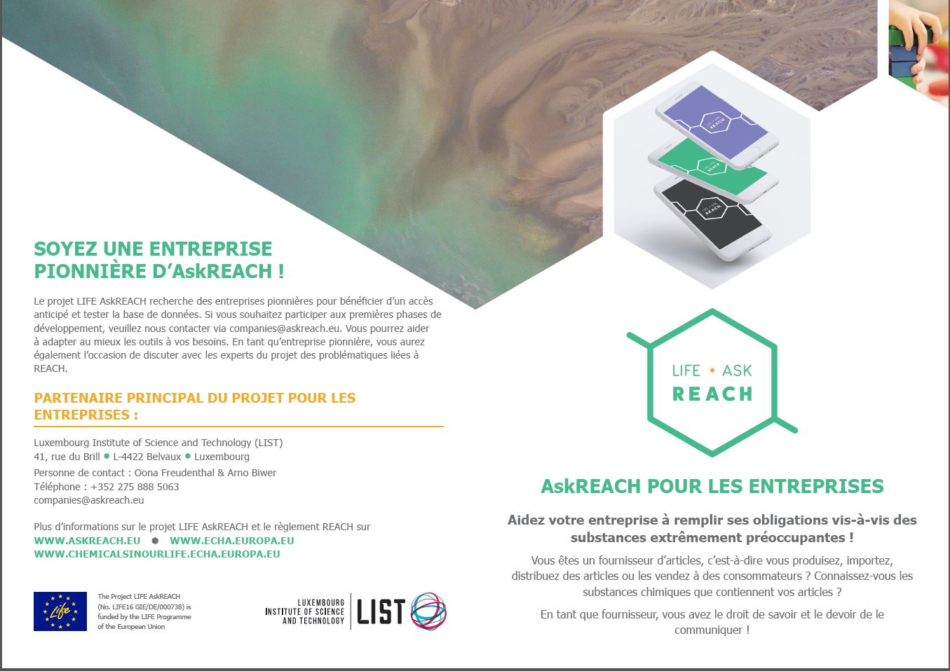 Le projet AskREACH développe des outils informatiques destinés à faciliter la communication au sujet des SVHC présentes dans la chaîne d’approvisonnement et affectant le consommateur. Le Luxembourg Institute of Science and Technology est un partenaire de projet et recherche actuellement des entreprises souhaitant devenir bêta-testeurs du système. Vous pouvez en savoir plus au sujet du projet sur le site Internet du Helpdesk REACH&CLP Luxembourg ou en envoyant un e-mail à l'adresse companies@askreach.eu.
