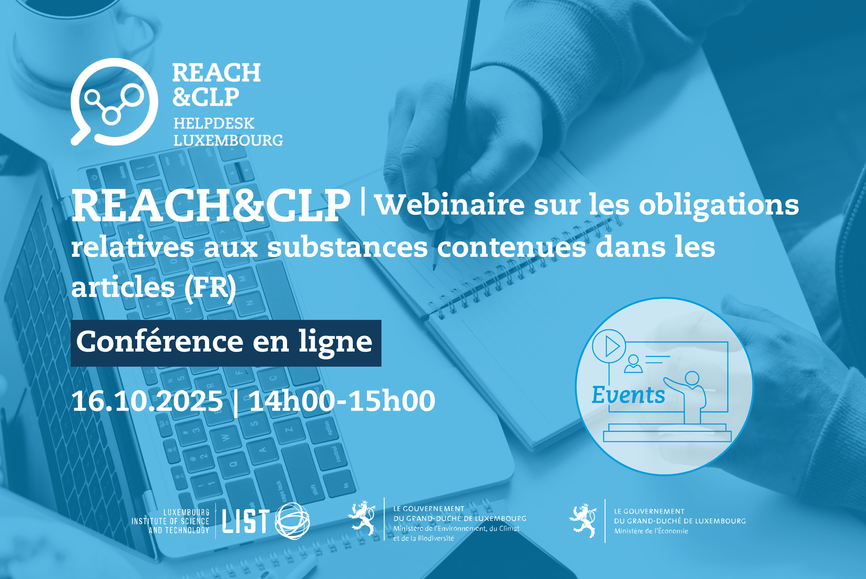 Le Helpdesk REACH&CLP Luxembourg organise un webinaire sur les obligations relatives aux substances contenues dans les articles. Ce webinaire se déroulera le jeudi 16 octobre de 14h00 à 15h00.